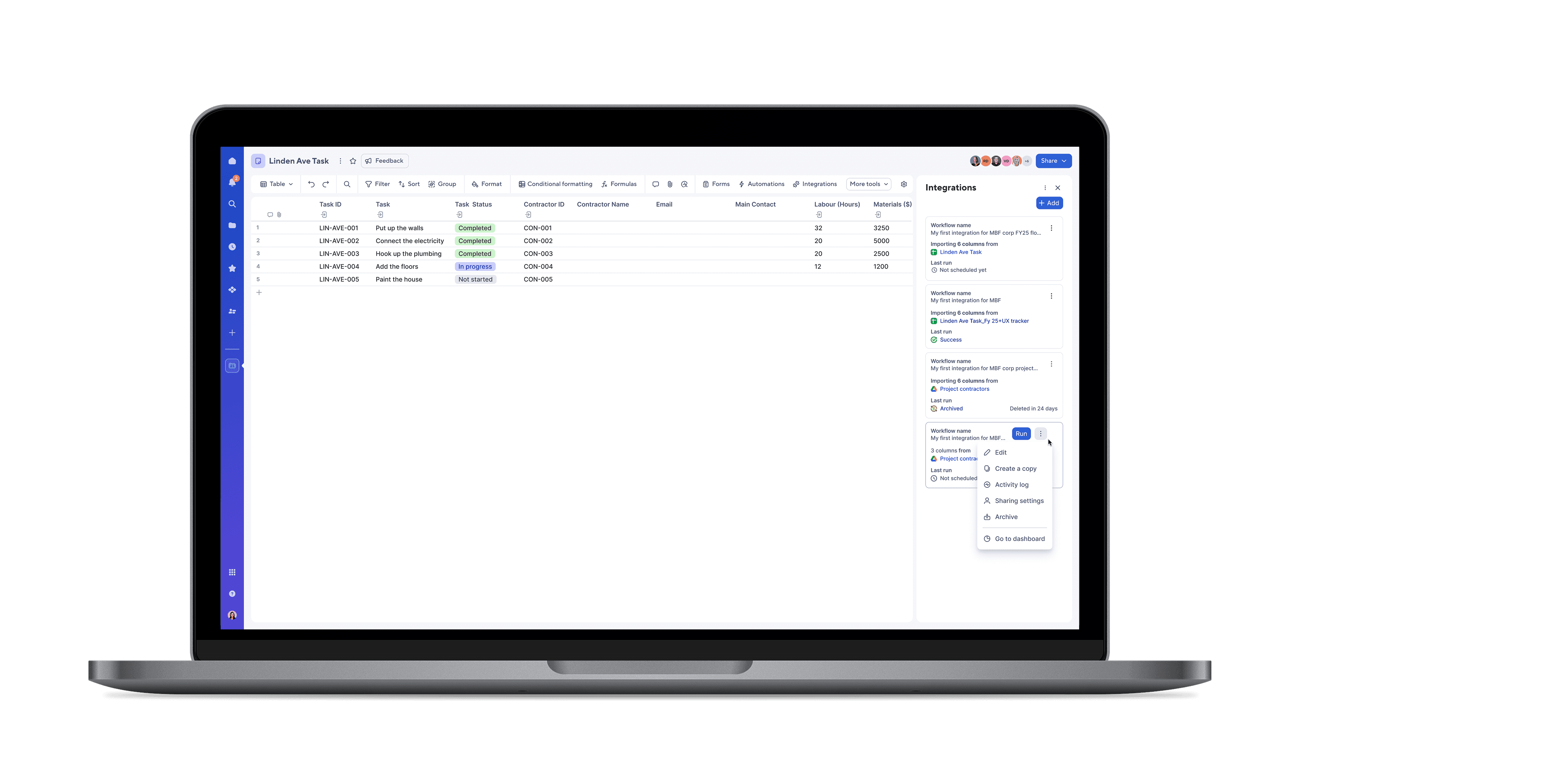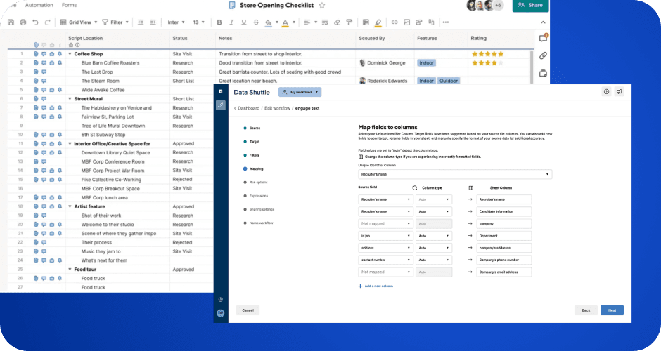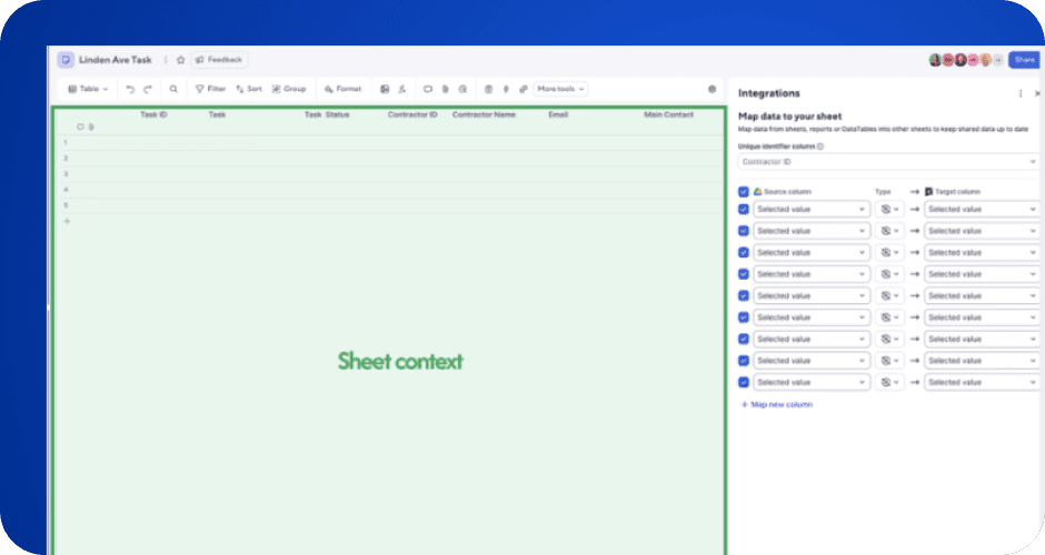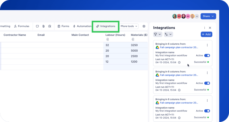 Integrations enable a contextual sheet experience with real-time updates and easy referencing.