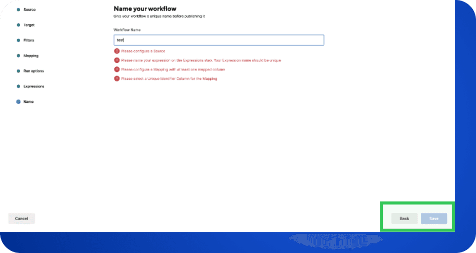 No option to exit anytime as it forces users to complete all the steps and then proceed to the dashboard to 'Run' the workflow.